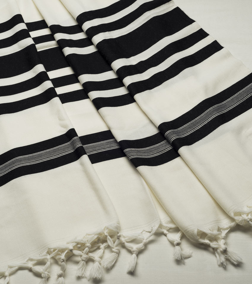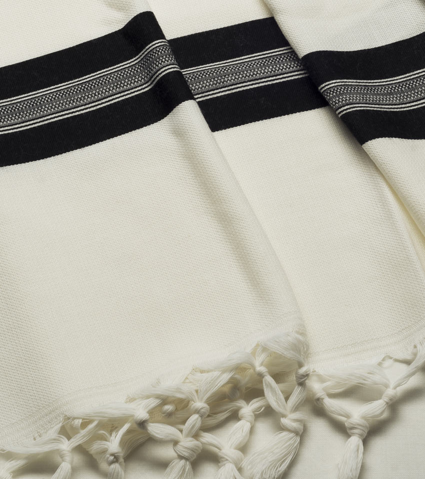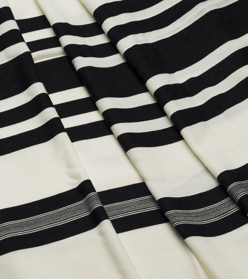 The Shabbat Tallit is a is an especially elegant tallit for the holy Shabbat, woven from pure wool yarns in a unique weave providing the tallit with a heavier and more substantial feel, combined with a slightly rough surface.